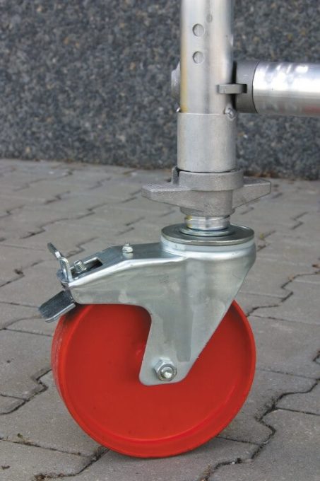 Mobilus aliuminis bokštelis ALTREX 4100. Dideli reguliuojami ratukai su stabdžiais.