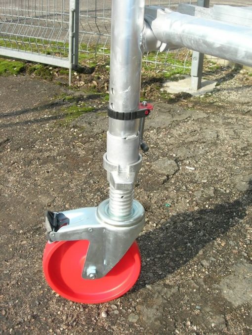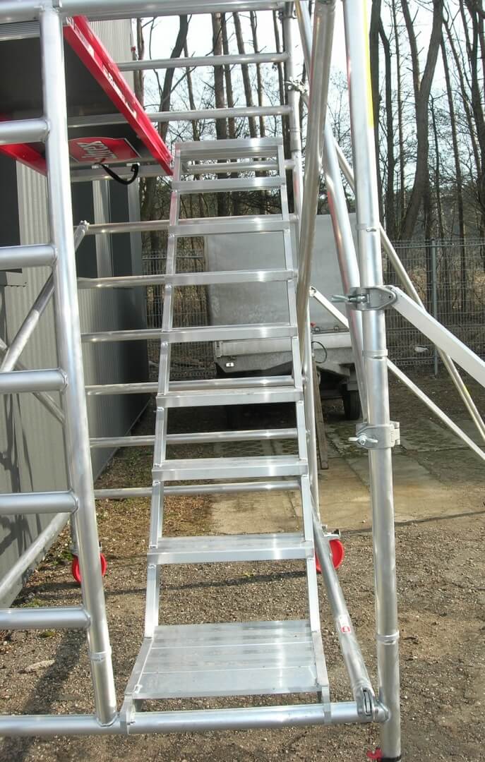 Mobilus aliuminis bokštelis laiptinė ALTREX. Lengvi aliuminiai užlipimo laiptai. Dideli reguliuojami ratukai su stabdžiais.
