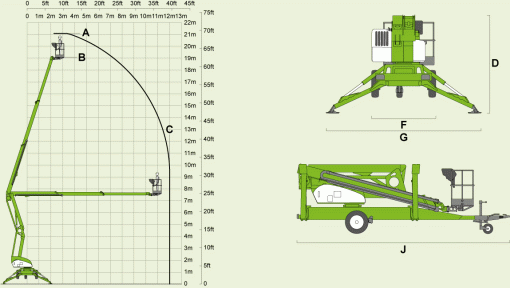Niftylift 210 priekabos tipo keltuvas turi vieną didžiausių neribojamų darbinių ribų savo klasėje.